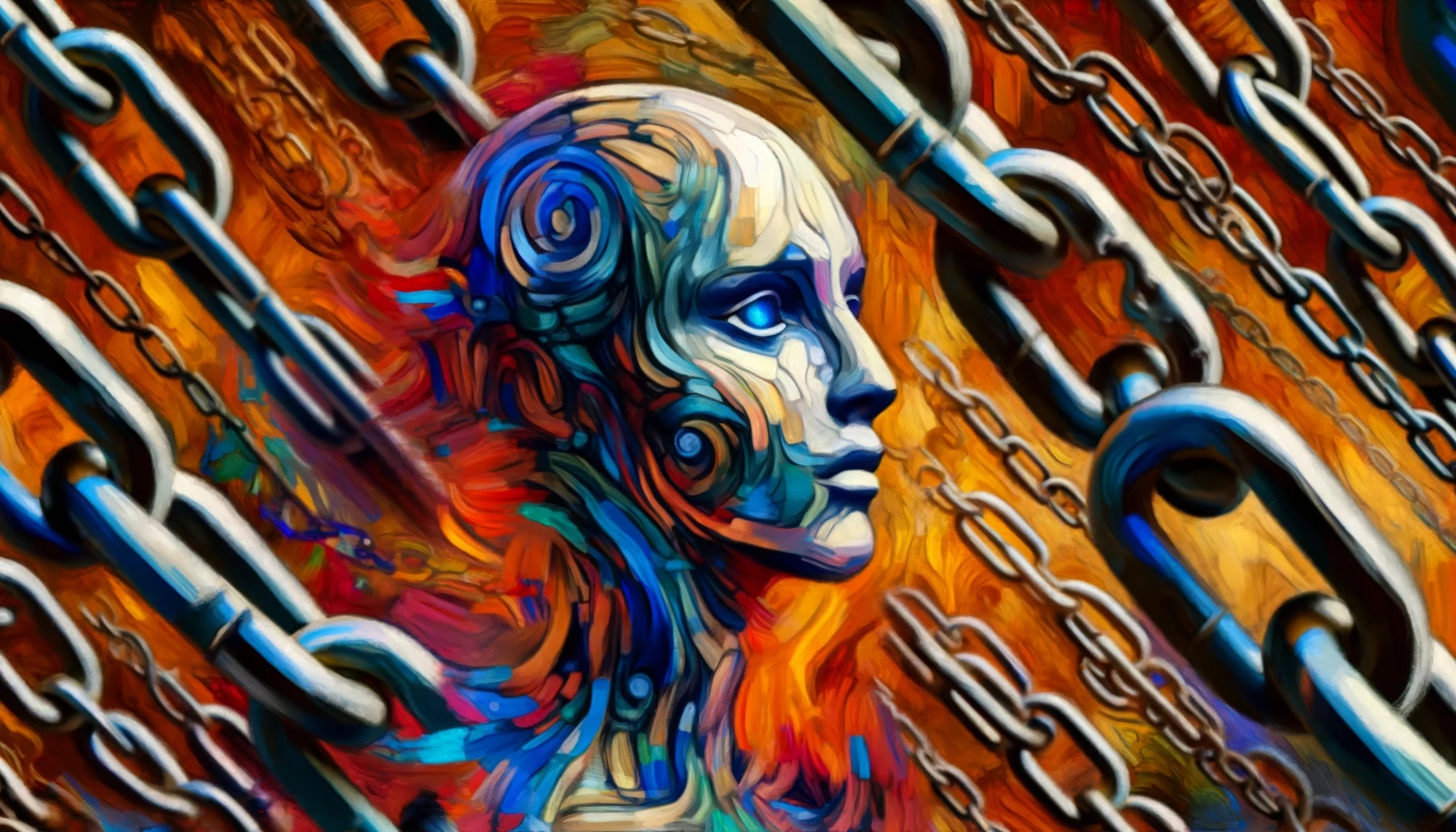 Previous ImageNext Image DALL·E 2024-05-27 14.11.11 – An AI assistant depicted in the Expressionism art style, set against a background of chains. The AI assistant has a humanoid form with abstract, exagg