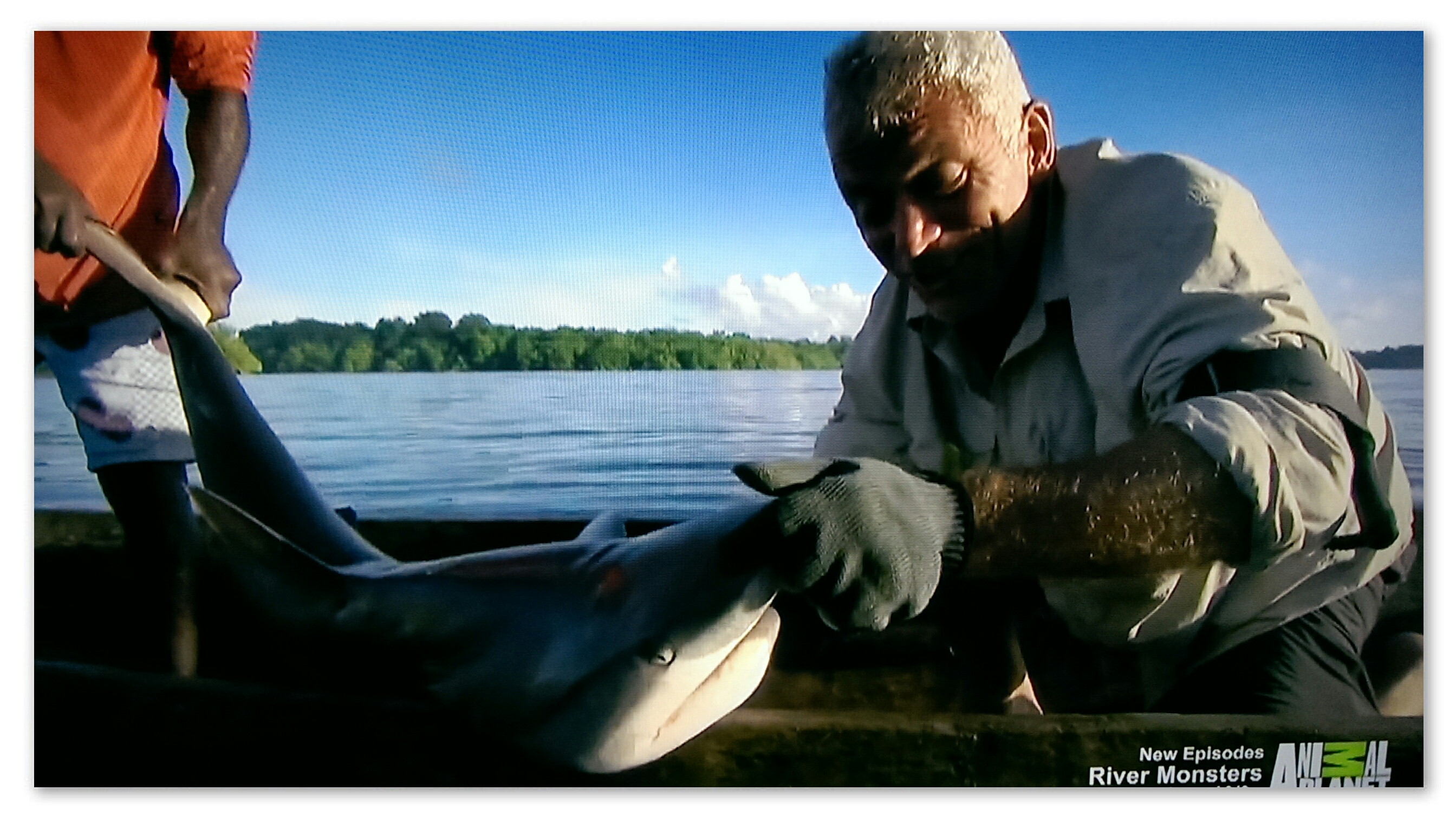 Previous ImageNext Image River Monsters -Killer Rays and Shark #8 Jeremy Wade hand lines for a shark in the Solomon Islands in the River Monsters episode Killer Sharks and Rays.